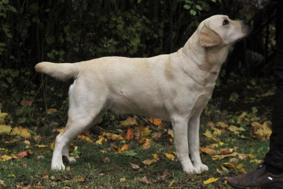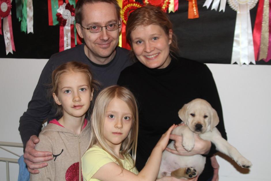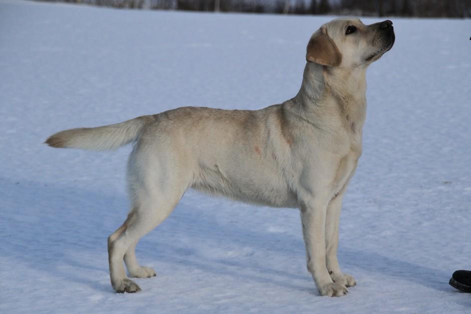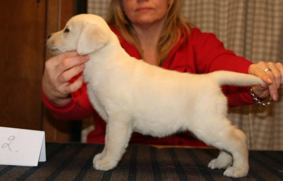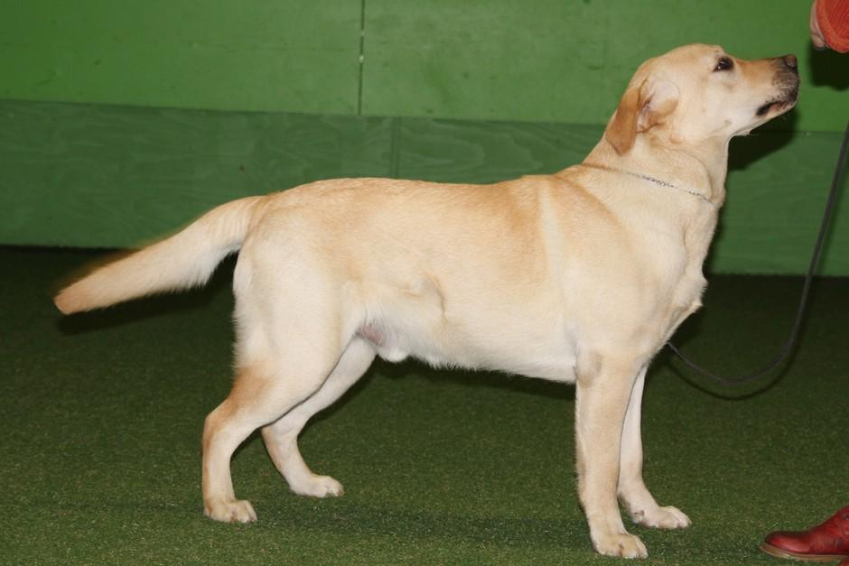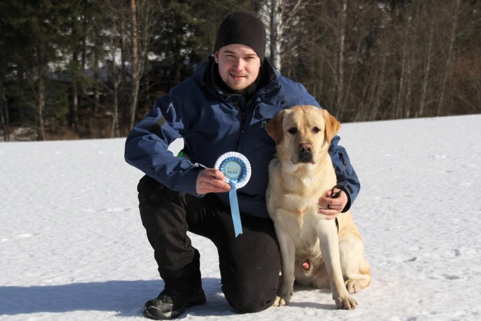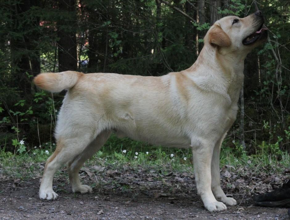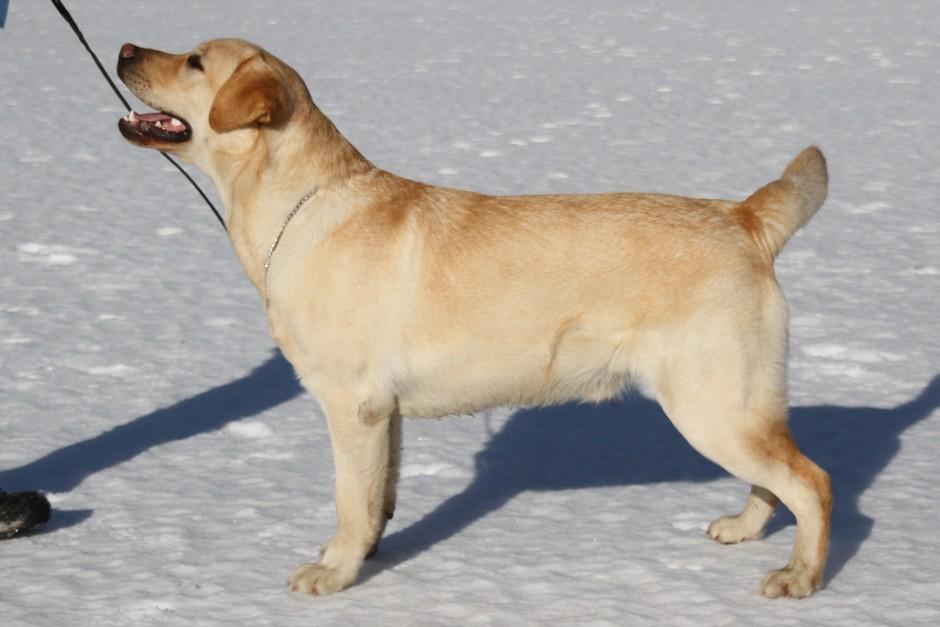Eddie 10 kk. Labradorien pääerikoisnayttelyssä Hyvinkäällä ison junioriluokan 2. SA, tuomarina Nancy Arbuckle, Hunt Club labradors, USA